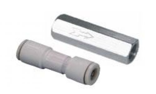 Válvula de retenção metálica ou plástica, roscas de 1/8" à 1/2" ou engate rápido para tubos Ø4, 6 ou 8mm.